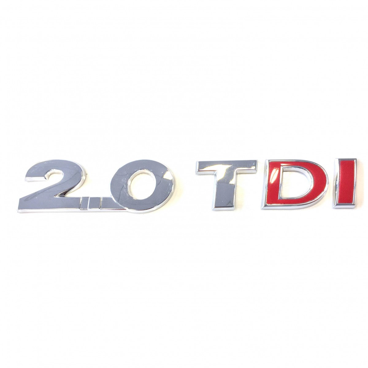2.0 TDI -Emblem für das Fahrzeugheck in Chrom und Rot.