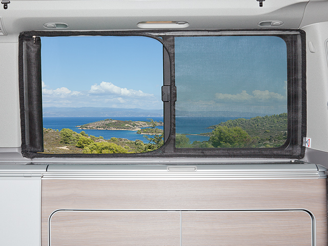 Die Befestigung am Fensterrahmen erfolgt mit Klettverschluss, passend zur Farbe der Fahrzeugverkleidung.