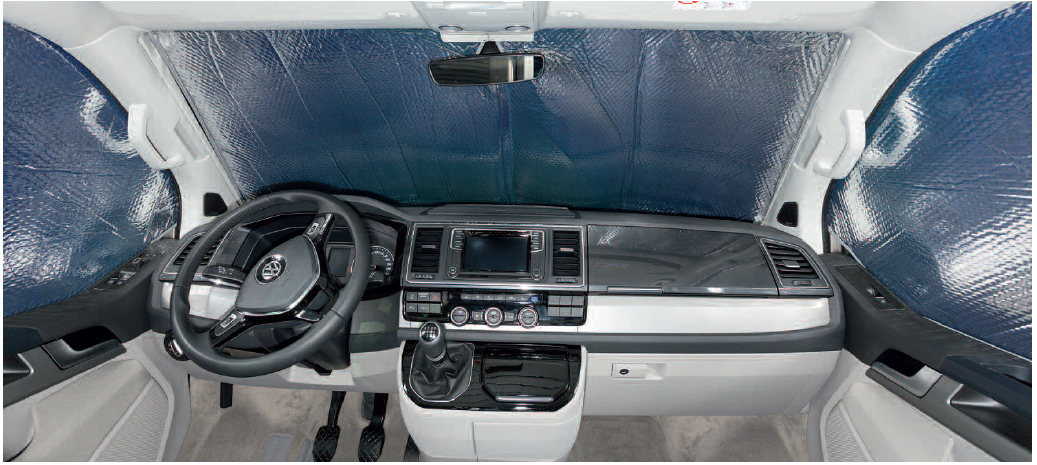 ISOLITE Inside beim Californa T6 : Perfekte Abdunkelung und Isolation der Fahrerhausfenster im Sommer, Übergangsjahreszeiten und Winter. Mit ISOLITE kann Sie von außen keiner sehen: Das Fahrerhaus ist völlig "Blickdicht". Die ISOLITE-Matten lassen sich sehr schnell anbringen und flach ausgelegt im Aufstelldach verstauen.