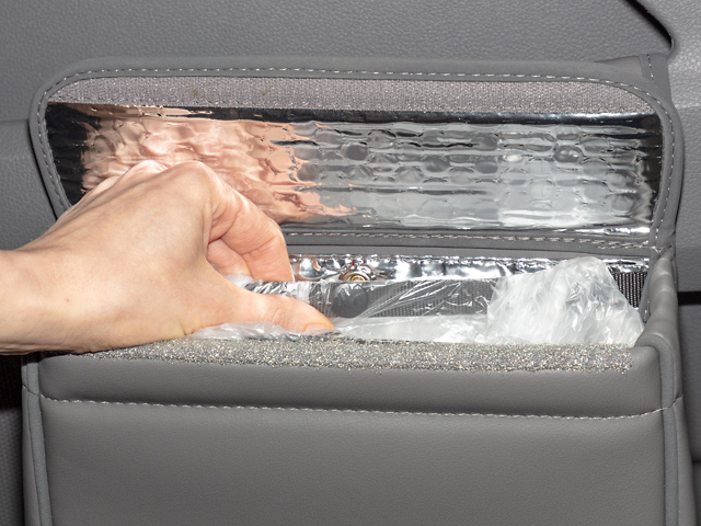 MULTIBOX hat eine isolierte Klappe mit Klettverschluss, die sich in Höhe der Sitzfläche befindet und während der Fahrt mit einer Hand leicht geöffnet und geschlossen werden kann.