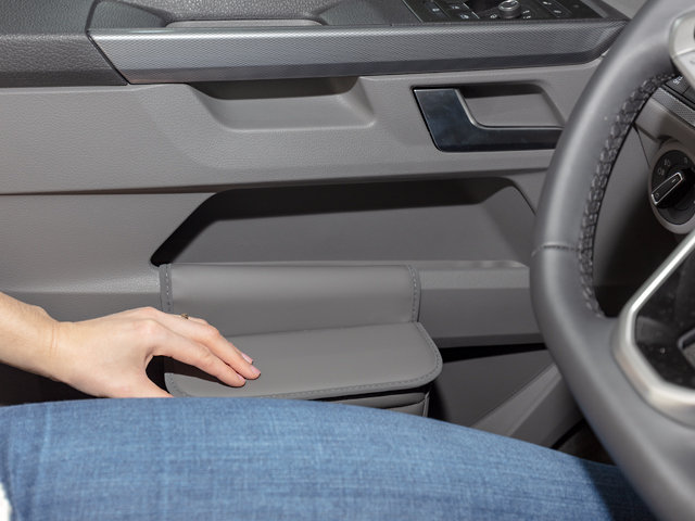 Die elegante MULTIBOX VW T6.1 lässt sich an alle VW-T6.1-Fahrerhaustüren anbringen. Die Multibox wird in der oberen Ablagemulde mit Klettverschluss eingehängt und unten mit Klettverschluss gesichert.