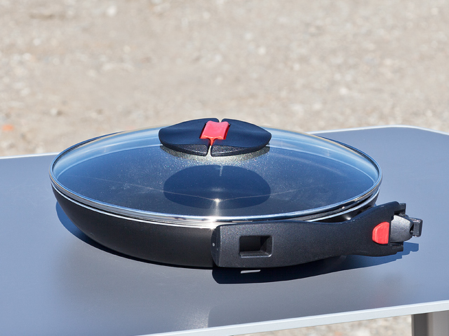 Der Pfannengriff lässt sich mit einem "Klick" anklappen: So lässt sich die Pfanne platzsparend verstauen.