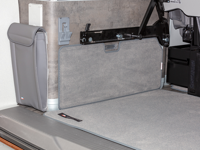 Mit dem eleganten und robusten Veloursteppich für den Heckladeraum rutscht das Gepäck nicht mehr auf den Aluschienen und ist wesentlich leiser. Wenn ein Vorzelt verwendet wird, kann die Matte auch als großer Fußabstreifer vor die Schiebetür gelegt werden.