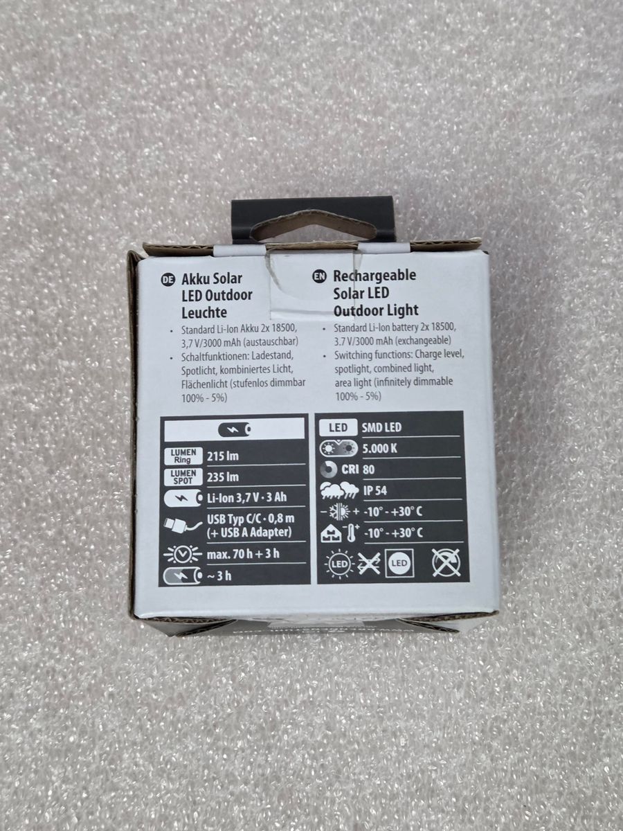 Die Akku Solar LED Outdoor Leuchte OLI 400 AS bietet mit zwei austauschbaren Standard-Li-Ion-Akkus des Typs 18500 (3,7V/3Ah) Flexibilität beim Aufladen, da sie bequem über das USB C-Kabel oder alternativ über das Solarpanel aufgeladen werden kann. Die Campinglampe bietet 450 Lumen und die Schaltstufen Ladestandsanzeige - ein Spotlicht - kombiniertes Licht - stufenlos dimmbares Flächenlicht (100% - 5%), sodass die Beleuchtung mühelos an unterschiedliche Anforderungen angepasst werden kann. Mit einer maximalen Leuchtdauer von 70 Stunden und einer Ladezeit von etwa 3 Stunden, ist diese Lampe der perfekte Begleiter für Aktivitäten im Haus, im Garten, beim Camping und Outdoor-Aktivitäten. Die Outdoor Lampe mit praktischer Powerbank-Funktion für das Aufladen von Smartphones und vielem mehr überzeugt zudem durch folgende Eigenschaften: