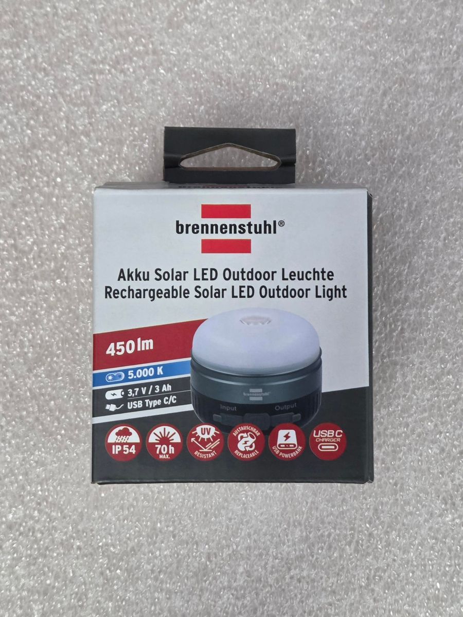 Brennenstuhl Akku Solar LED Outdoor Leuchte OLI 400 AS (Campinglampe IP54 mit 450lm, bis zu 70h Leuchtdauer, Schaltstufen, dimmbar, 2 austauschbare Li-Ion-Akkus 18500, Powerbank, USB C Ladekabel)