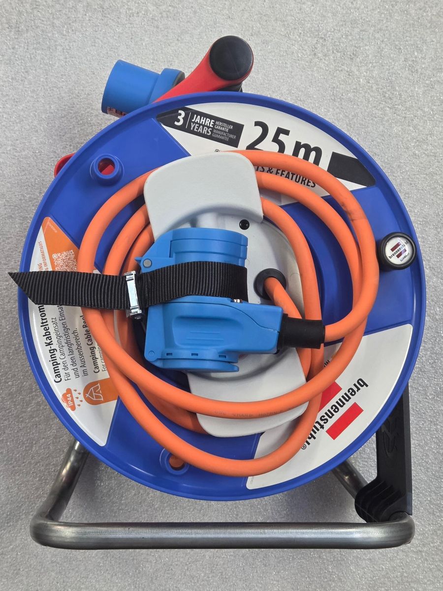 Das Brennenstuhl Camping-Set VW klein bestehend aus einer CEE 230V Kabeltrommel, Trommeltritt und einer robusten Transport- und Aufbewahrungstasche, ist die perfekte Lösung für Camping- und Outdoor-Abenteuer. Die Kabeltrommel verfügt über 25m (23+2m) RN-Kabel, einen zuverlässigen Überhitzungsschutz sowie eine Kontrollleuchte, die bei Überhitzung und Überlastung aktiviert wird. Das RN-Kabel in der Signalfarbe orange ist extrem robust, ölbeständig und für den dauerhaften Einsatz in Außenbereichen bestens geeignet. Der Trommelkörper ist aus Spezialkunststoff gefertigt und auf einem verzinkten Tragegestell montiert, wodurch er besonders langlebig und robust ist. Zusätzlich ist die Kabeltrommel mit dem innovativen Tragegriff "cablepilot" ausgestattet, welcher freie Hände beim Transport, praktisches Aufhängen und schnelles Ab- und Aufrollen ermöglicht. Die dazugehörige Transport- und Aufbewahrungstasche ist aus strapazierfähigem, staub- und wasserabweisendem Material hergestellt und bietet optimalen Schutz für die Kabeltrommel. Zudem überzeugt das Set durch folgende Eigenschaften: 1x Kabeltrommel mit CEE-Winkelkupplung (230V/16A) inklusive Schutzkontakt-Kombisteckdose (230V) mit selbstschließendem Deckel + 230V/16A CEE Stecker - Made in Germany