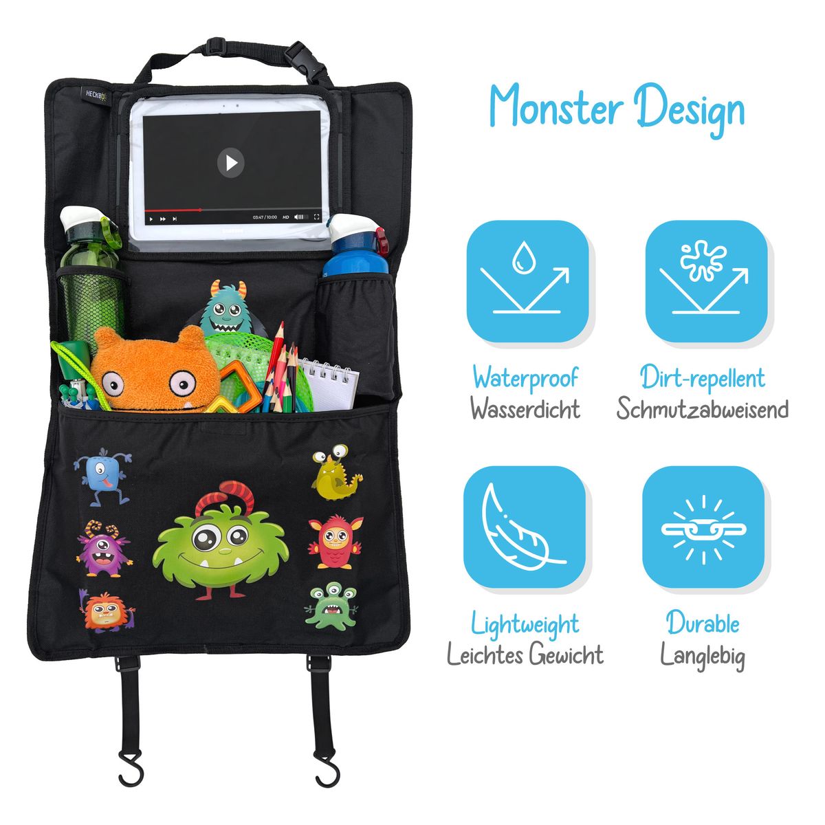 ► KINDGERECHTES MOTIV: Auf diesem schwarzen HECKBO Rückensitzschutz ist ein cooles Motiv mit verschiedenen Monstern in bunten und kräftigen Farben aufgedruckt – ein Must-Have für alle Kinder, die Monster lieben. Zu diesem Design bieten wir übrigens auch passende Monster Sonnenblenden und einen Monster Turnbeutel.