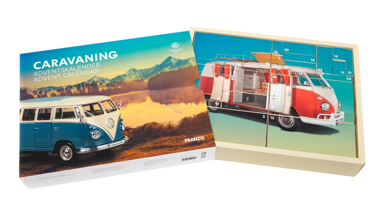 Original VW Caravaning Adventskalender Der VW Bulli T1 hat dank seiner Vielseitigkeit wie kein anderes Automobil den Trend zu Caravaning und Camping begründet. Mit dem Caravaning Adventskalender können sich kleine und große Bulli-Fans jetzt eine komplette eigene kleine Erlebniswelt rund um den Klassiker im Maßstab 1:24 aufbauen. Ein umfangreiches Begleitbuch zeigt Geschichte und Geschichten rund um eine immer beliebter werdende Art des Verreisens. Der Adventskalender enthält: Einen achtteiligen VW-Bulli-T1-Modellbausatz im Maßstab 1:24 Wissenswertes und Spielerisches für Caravaning-Fans Ein großformatiges Begleitbuch von Kultur- und Reisejournalist Christian Steiger Und vieles mehr! Modelltyp: Caravaning VW Bulli T1 Altersangabe: ab 14 Jahren Maßstab: 1:24 Sprachen: deutsch