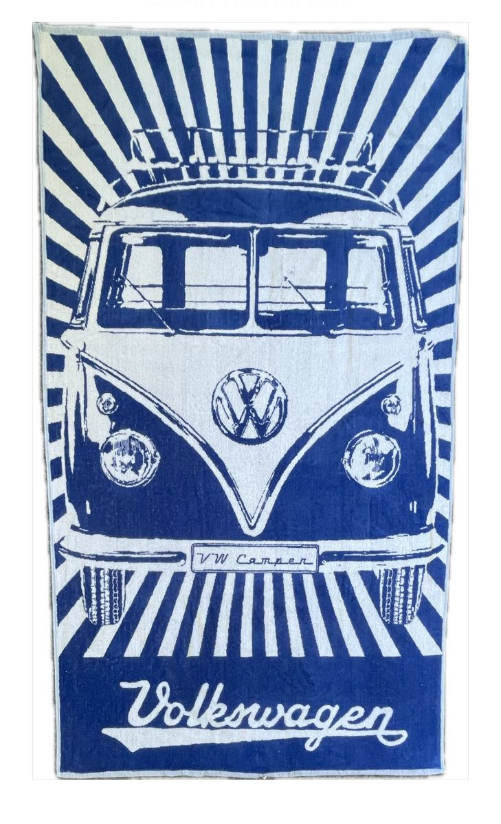 Dieses stilvolle Standtuch von VW in kräftigem Blau misst 160x90 cm und besteht zu 100% aus ägyptischer Baumwolle. Es zeigt ein ikonisches T1 Bulli-Motiv in Weiß. Mit seinem klassischen Design des Bullis ist es der perfekte Hingucker für alle VW-Fans.
