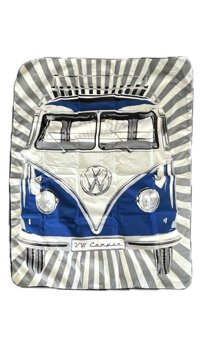 Hochwertige Original VW Picknickdecke mit wasserabweisender Unterseite im legendären blauen VW-Bulli T1-Design. Das gesamte Design ist in Blau gehalten, was der Decke einen besonderen Charme verleiht. Sie wird in einer dazu passenden, dekorativ bedruckten Tragetasche geliefert. Maße: ca. 2 x 1,50 m.