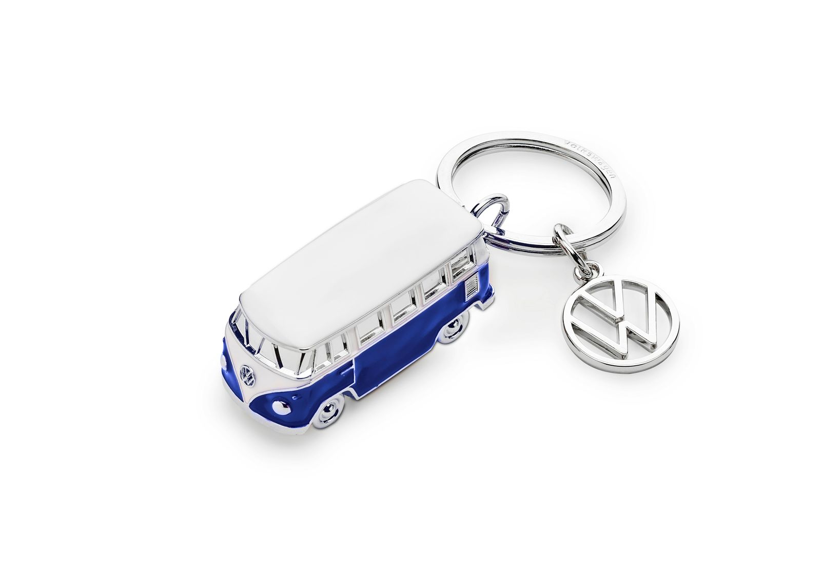 Schlüsselanhänger im T1 Design, 1H2087010Bblau/ weiß - T1 Schlüsselanhänger als 3D Modell- zweifarbig, blau/weiß lackiert- Silberfarbene Details- mit Logoanhänger- gelaserter Volkswagen Schriftzug im Schlüsselring