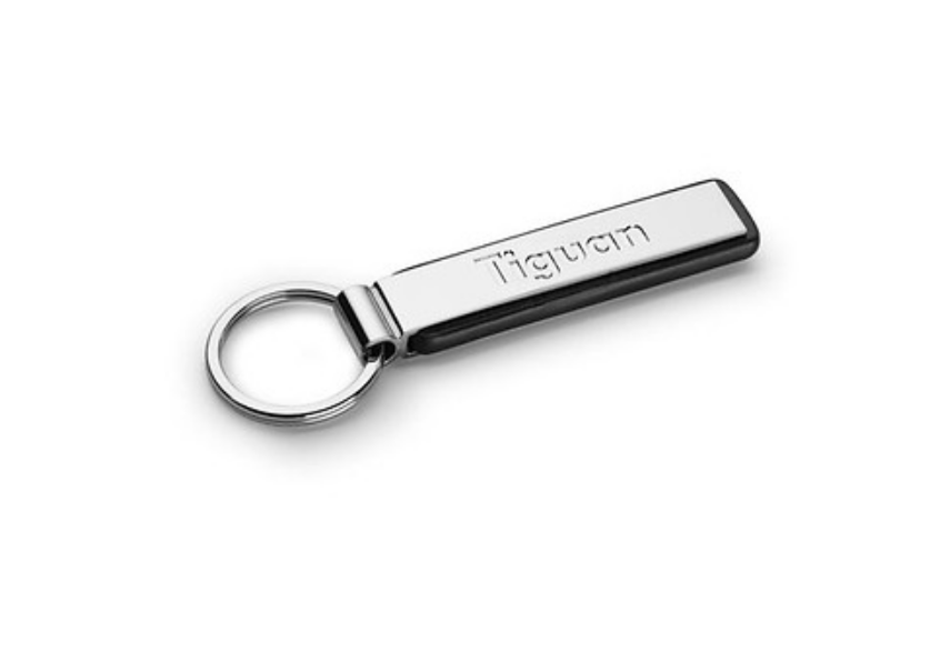 Hochwertiger Metallschlüsselanhänger in Kombination mit PU-Leder. Der Artikel trägt den Schriftzug Tiguan als Gravur.