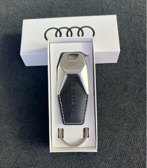 Audi Schlüsselanhänger Leder Q4 e-tron Details:- Audi Schlüsselanhänger mit Q4 e-tron Branding- Mit Spaltring - Made in Germany Material:Rindsleder, Metall, Polsterung: TPE KunststoffFarbe:Schwarz/Silber