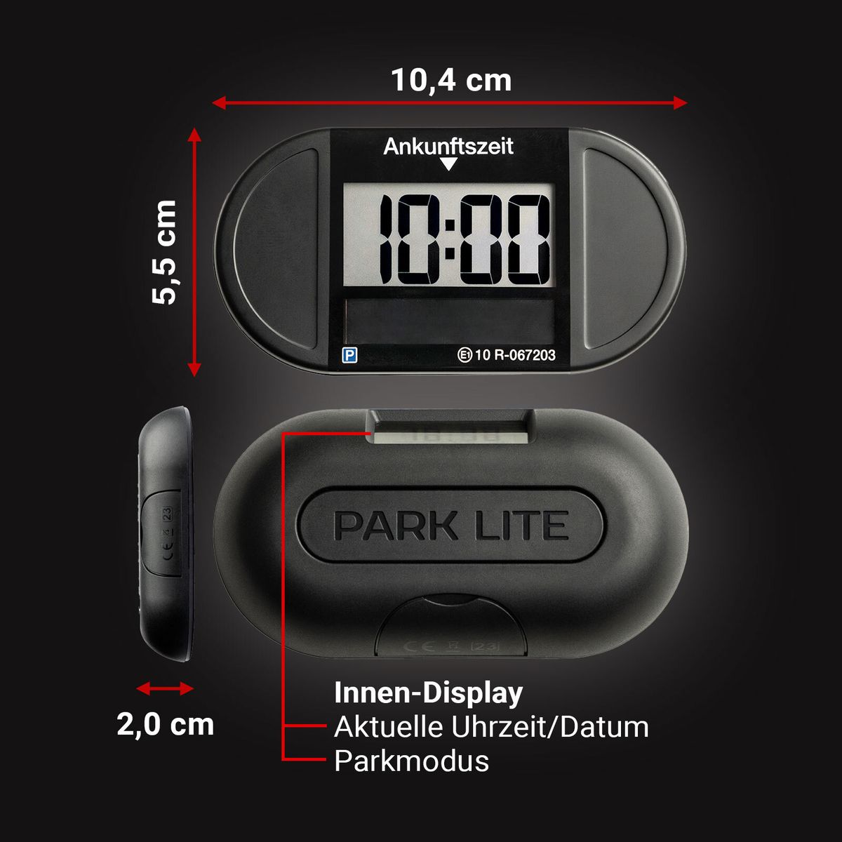 - Setzt die Parkzeit automatisch fest, kann jedoch manuell über Tasten auf der Rückseite angepasst werden.