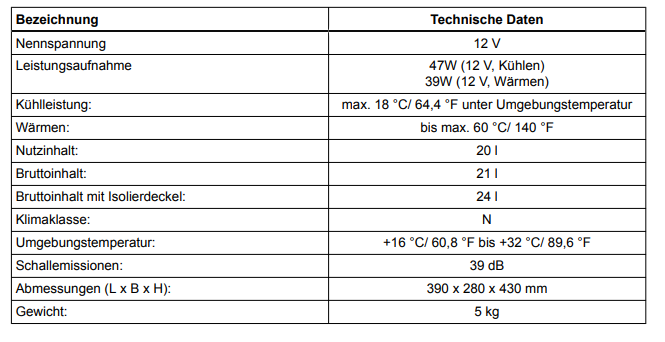 Die Box kühlt bis max. 18°C unter Umgebungstemperatur und heizt auf max. 60°C.