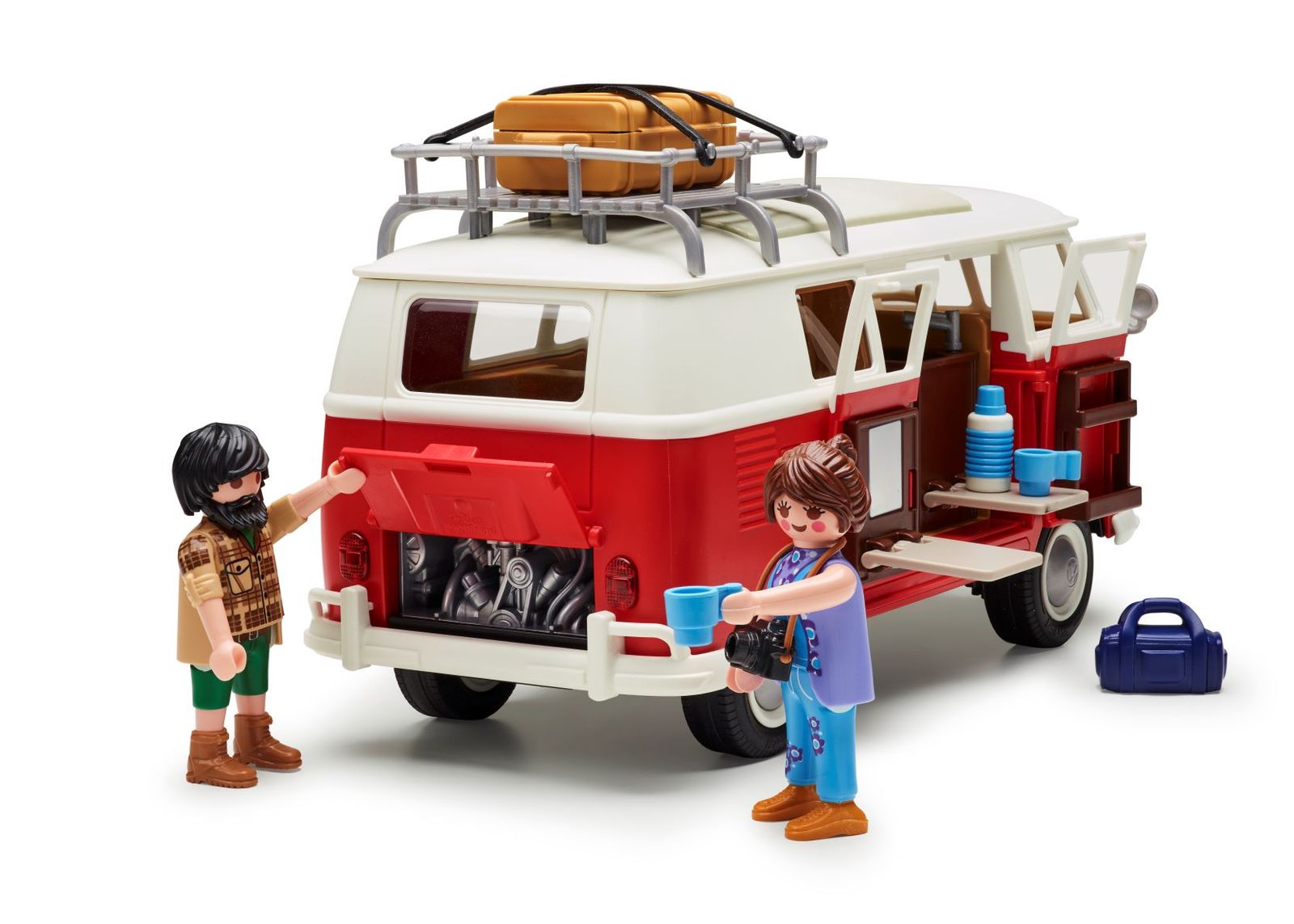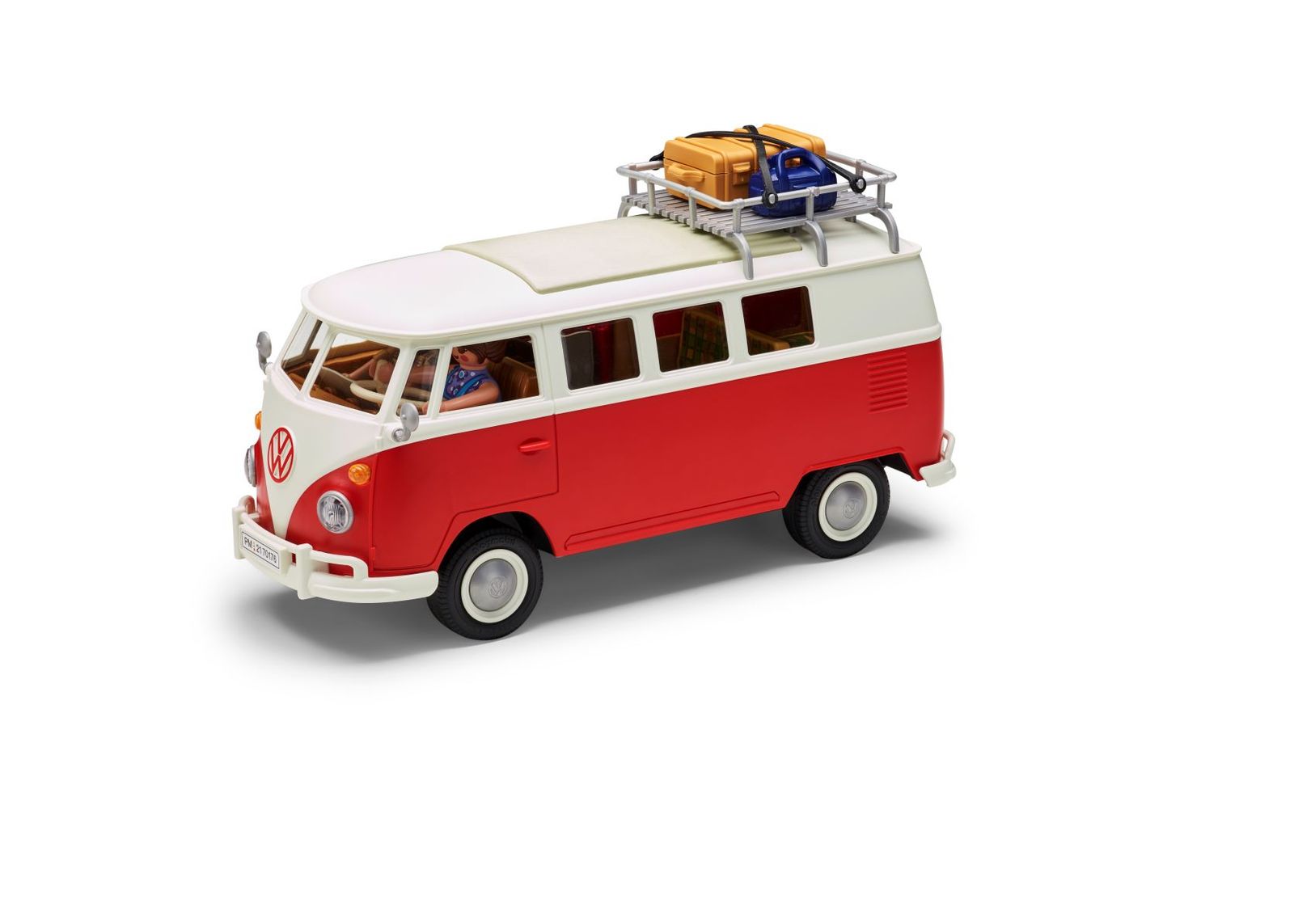 - Enthaltenes Zubehör: 1 Volkswagen T1 Camping Bus, 1 Gepäckträger, 1 Koffer, 1 Reisetasche, 1 Landkarte, 1 Fotoapparat mit Riemen, 2 Kissen, 1 Flasche, 2 Tassen, 2 Zahnbürsten, 1 Haarbürste, 1 Tube, 2 Konservendosen, 1 Brotbox, 1 Kekspackung, 1 Milchpackung