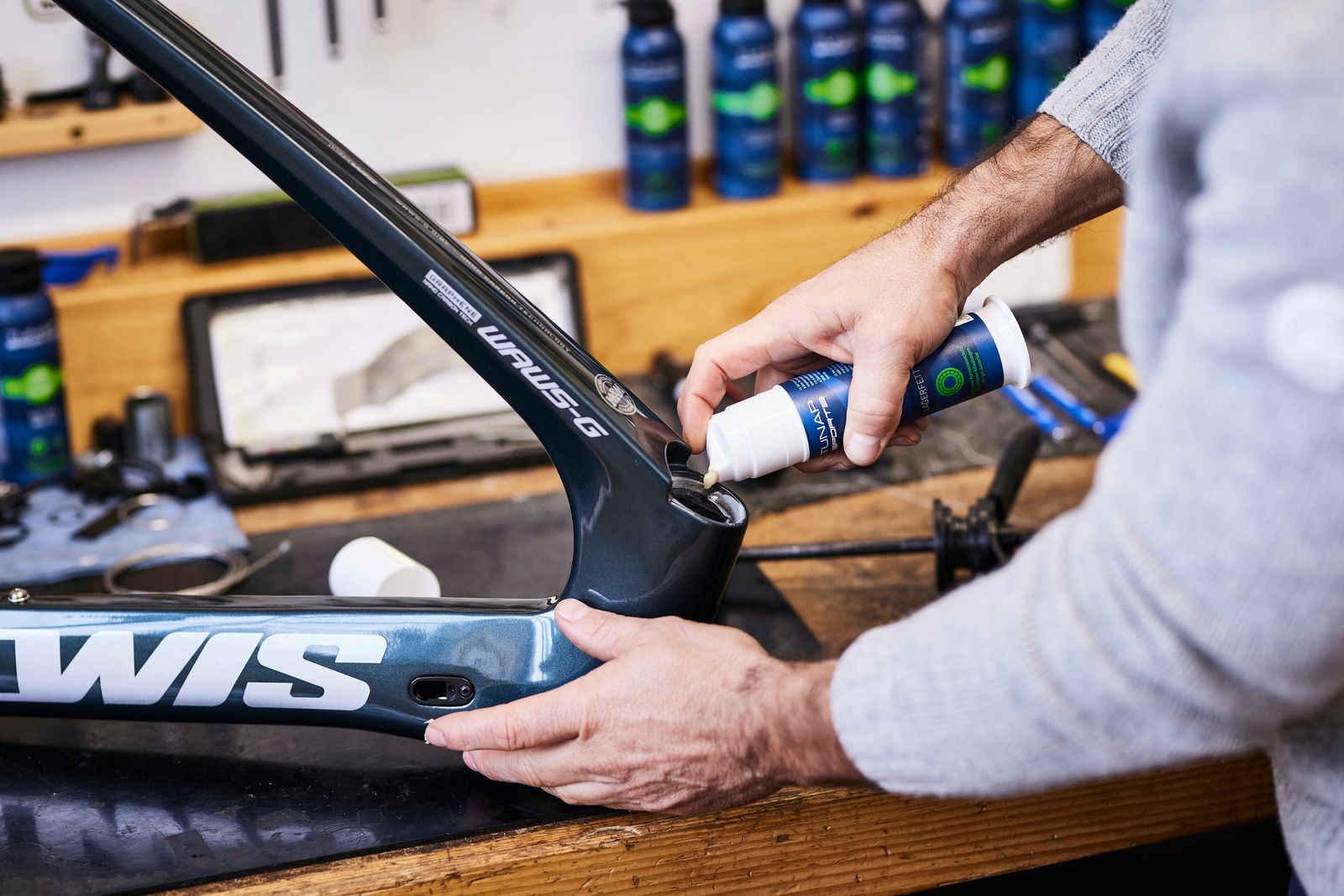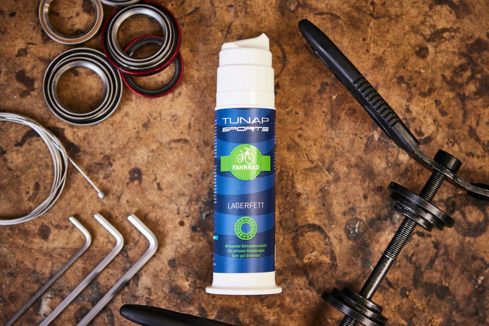 Das TUNAP SPORTS Lagerfett schützt alle beweglichen Teile am Fahrrad vor Nässe und Korrosion.