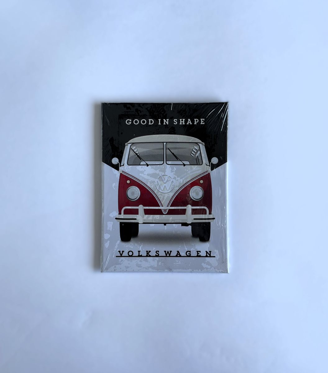 Dieser Magnet zeigt den klassischen, weiß-roten VW Bus T1 auf einem schwarzen Hintergrund. Mit der Aufschrift „Good in Shape“ oben und dem Volkswagen-Schriftzug unten ist er ein tolles Sammlerstück für alle VW-Fans.