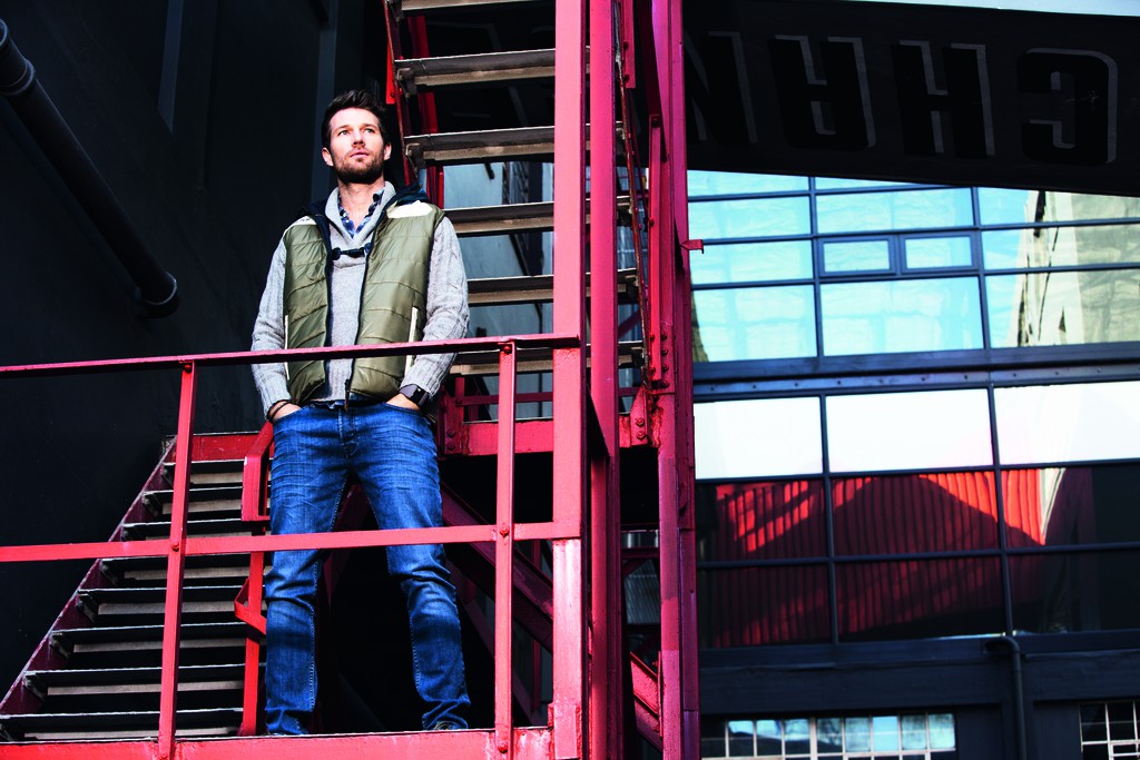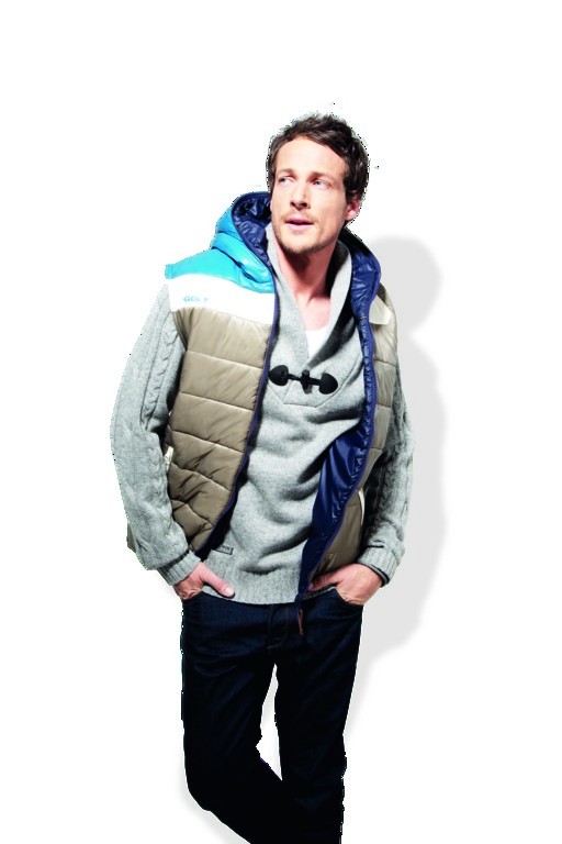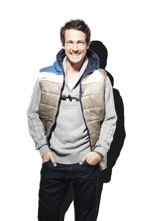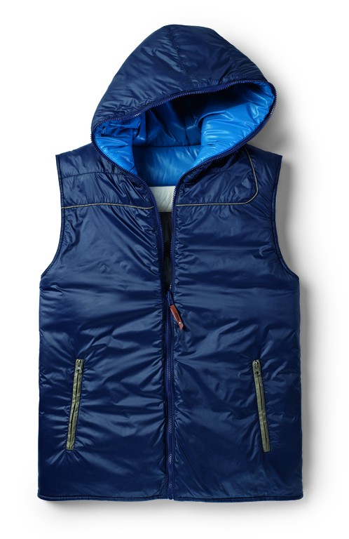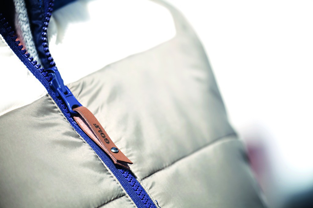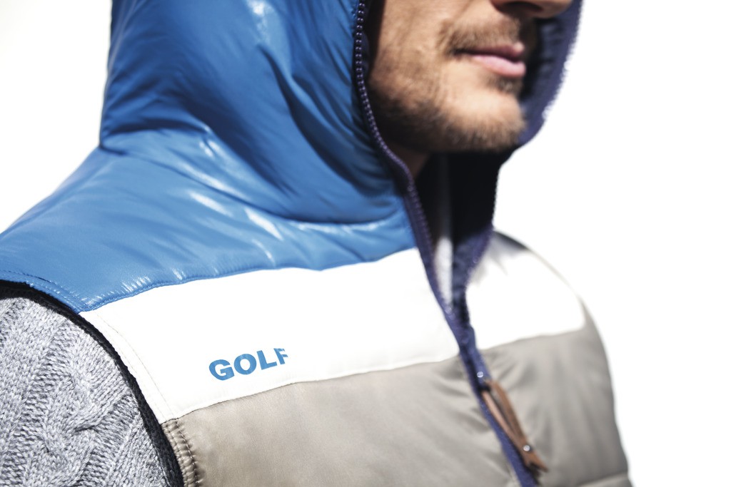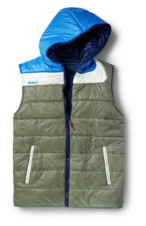 Herren Weste mit Wendefunktion und Kapuze, mehrfarbige Seite (schlamm/offwhite/ mittelblau) glänzende Warenoberfläche gesteppt, einfarbige Seite (dunkelblau) matte Warenoberfläche ungesteppt, wärmende Wattefüllung aus recyceltem Polyester und Kaffee, Rundum Front-Reißverschluss läuft auch durch die Kapuze, Anfasser in Kunstleder mit geprägtem „Golf“-Schriftzug, 2 Reißverschlusstaschen auf jeder Seite, “Golf“ Druck auf der Front, bzw. im Rücken